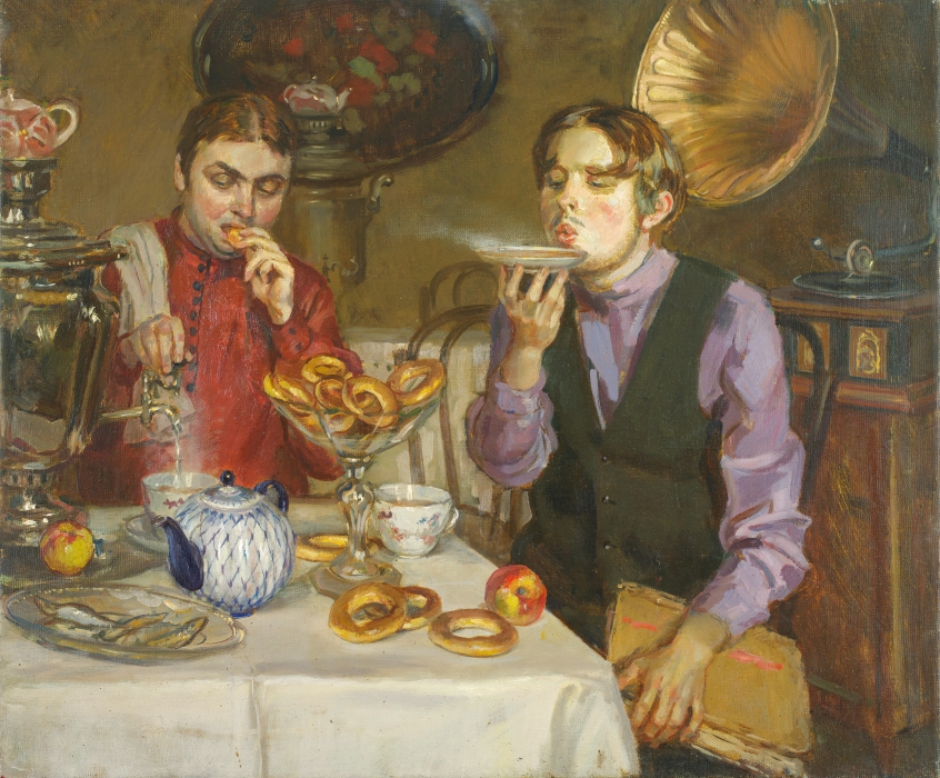 Чаепитие — одна из любимых тем в русской живописи XIX–XX веков.Самовар, баранки, варенье и уютные посиделки символизировали русский быт, достаток и душевность. Художники часто изображали эту сцену, от социальной сатиры до идеализированного уюта.