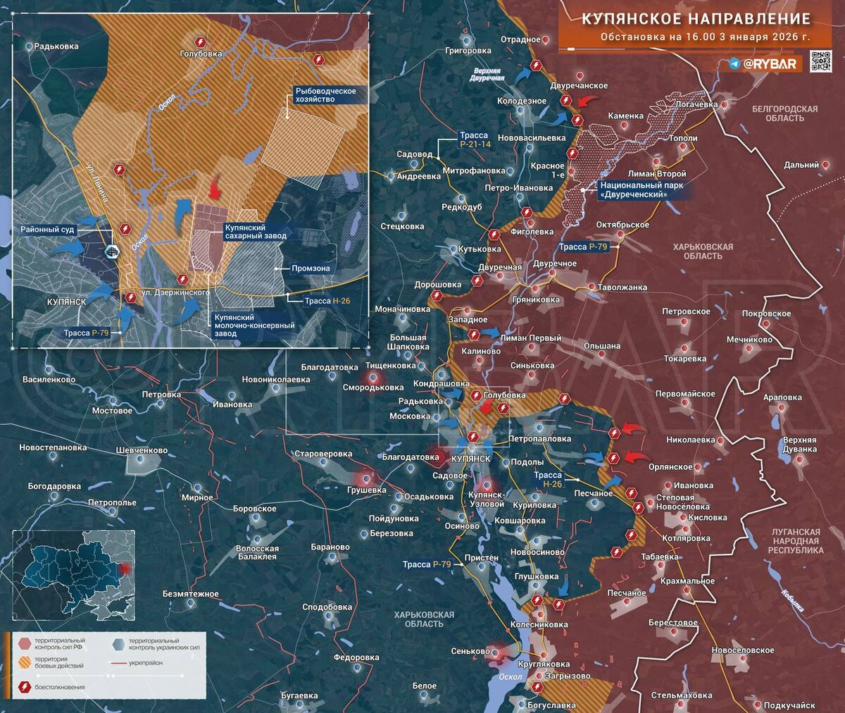 Ситуация в Купянске остаётся сложной. Несмотря на успешные мероприятия на левом берегу Оскола, где ВС РФ удержали позиции в промзоне, на правобережье противник постепенно расширяет зону контроля. Вражеские штурмовые группы, согласно кадрам от Военкоров Русской Весны, достигли здания районного суда в центре Купянска. Противник предпринимает попытки выйти к руслу Оскола, однако не может уверенно закрепится на участке из-за работы российских дроноводов. 📌 Обстановка в соседней Московке остаётся неопределенной. По появившимся ранее в Сети кадрам с якобы присутствием в селе российских подразделений определить принадлежность военнослужащих сложно. К тому же село находится более чем в пяти километрах от актуальной ЛБС и подобный «прорыв» был бы подтвержден дополнительными видео с обеих сторон. ❗️В то же время после некоторого прояснения погоды российские операторы БЛА наконец-то получили возможность работать в полную силу, что частично нивелирует численное превосходство ВСУ. Противник вновь
