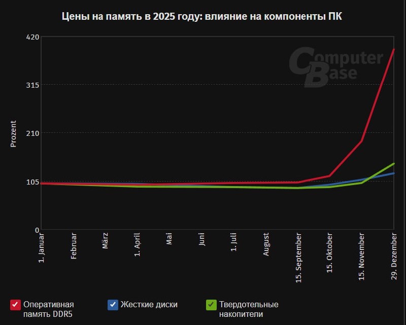 Рынок памяти пережил один из самых тяжёлых годов за последнее десятилетие. По данным ComputerBase, к концу 2025‑го некоторые комплекты DDR5 подорожали более чем в четыре раза — и это напрямую связано с глобальным дефицитом DRAM и взрывным спросом со стороны ИИ‑инфраструктуры. Вот ключевые цифры: • Средний рост цен на оперативную память за год — +292 % • Crucial Pro UDIMM DDR5 32 ГБ: с 95 € в январе до 360 € в декабре • SSD подорожали в среднем на 43 % • Популярные модели вроде Lexar NM790 2 ТБ — +69 % • Бюджетные NVMe — рост более чем на 100 % • HDD остаются самым стабильным сегментом: +22 % в среднем • Но крупные диски 16–22 ТБ дорожают быстрее, чем 4–8 ТБ Темпы роста начинают снижаться: • В ноябре ОЗУ дорожало на 1,71 % в день • К концу года — уже 1,63 % • HDD — всего 0,27–0,28 % в день Эксперты считают, что пик паники позади, но снижение цен в ближайшие месяцы ждать не стоит. Особенно тяжёлая ситуация — на рынке SSD, где рост только ускоряется. Как думаете, что упадёт первым — DD