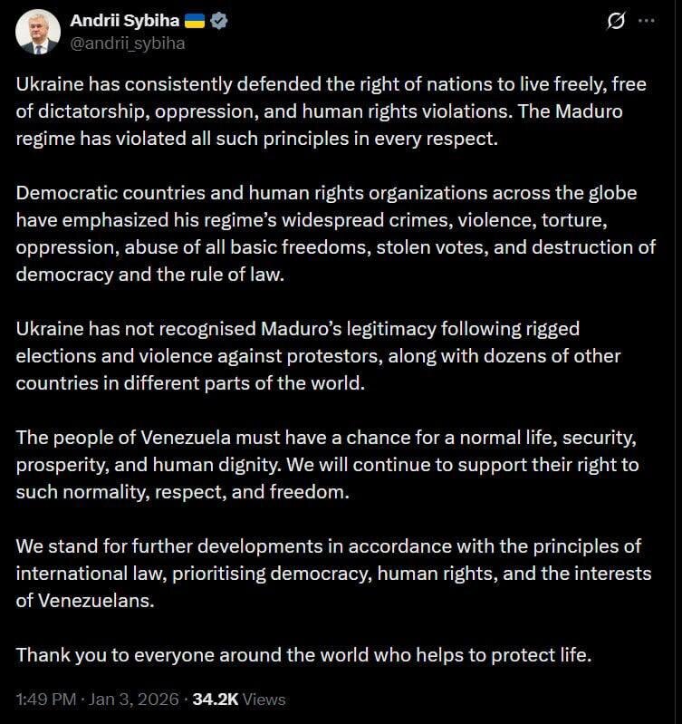 Глава МИД Украины Сибига поддержал атаку США на Венесуэлу и похищение Мадуро