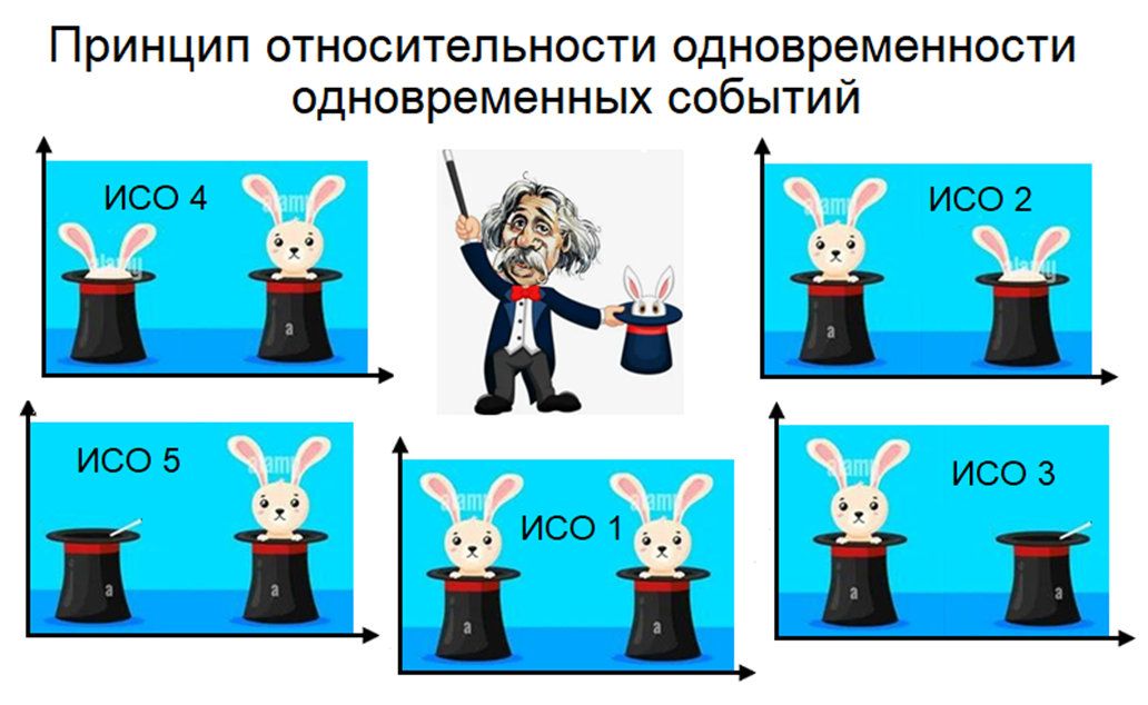 По сути, Эйнштейном, провозглашён принцип относительности одновременности одновременных событий, а если ещё точнее – принцип неодновременности одновременных событий! Ни больше, ни меньше, поскольку одновременные события в какой-либо системе отсчёта для наблюдателей во всех других инерциальных системах отсчёта являются неодновременными. Причём не видятся, а именно являются неодновременными!