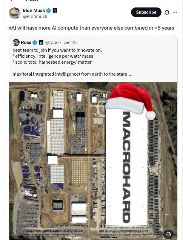 Илон Маск снова делает ставку на масштаб. По его словам, уже в течение ближайших пяти лет xAI будет располагать бо́льшими вычислительными мощностями, чем все остальные компании в индустрии ИИ вместе взятые. Звучит как типичный масковский тейк, но цифры под этим заявлением выглядят вполне приземлённо — и от этого ещё тревожнее. В Мемфисе прямо сейчас строится дата-центр Colossus 2. Его текущая мощность уже превышает 400 МВт, а целевая планка — 2 ГВт. Если проект доведут до конца, это будет первый в мире полноценный гигаваттный дата-центр, заточенный под обучение и эксплуатацию ИИ-моделей. Для понимания масштаба: это уровень энергопотребления небольшого города. Параллельно xAI привлекает около 20 млрд долларов на закупку дополнительных GPU. Речь идёт не просто о расширении кластера, а о попытке выстроить вычислительное доминирование как стратегическое преимущество. В логике Маска побеждает не тот, у кого лучший алгоритм сегодня, а тот, кто может позволить себе обучать самые тяжёлые мод
