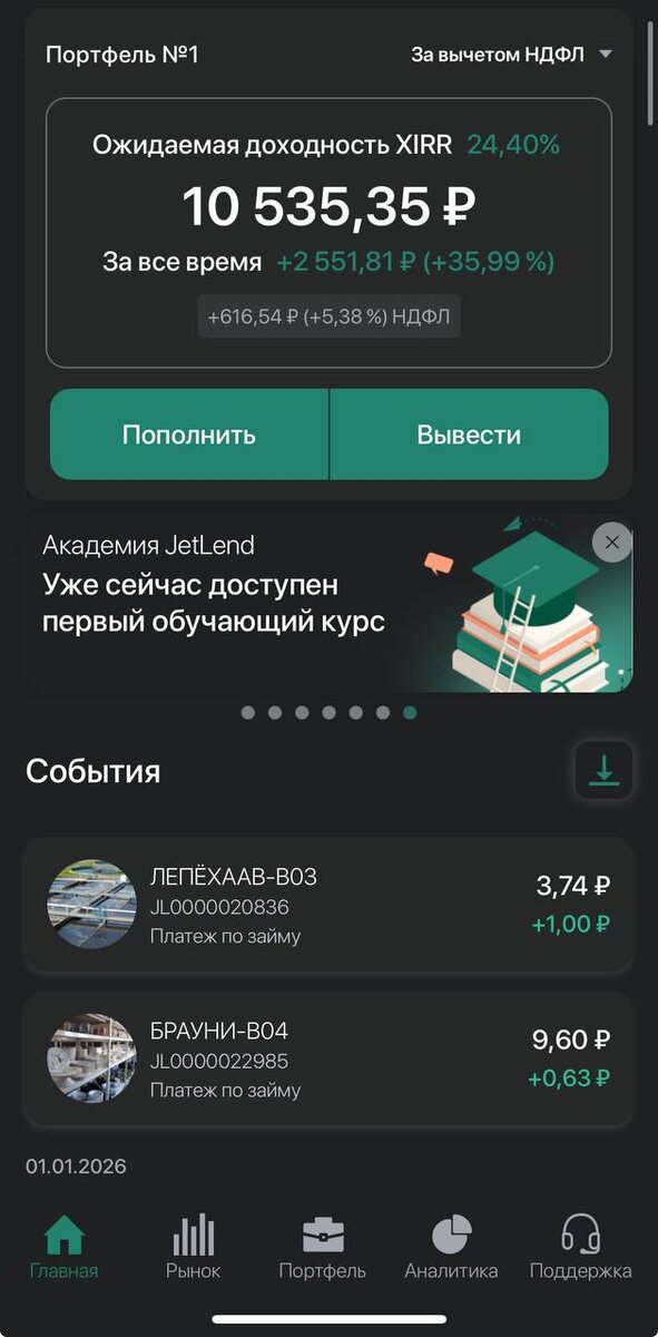 И это я сейчас на про вклады или Яндекс Сейв, а про краундлендинговую платформу JetLand. Копеечка начала приходить с 1 января, трудится МСП, как бы трудно не было. На платформу я зашла не по своей воле — студентам хотелось показать внутрянку, а не просто выдержку из учебника, что так можно. Учебники в массе своей — перевод иностранной литературы порой без коррекции на российские реалии. И это реальная проблема современного высшего образования. При всех классных продуктах, которые развиваются у нас сейчас, многие ВУЗы просто не успевают адаптироваться. И это не преподаватели такие, а не внедрен механизм обучения студентов в реальных компаниях. Понятно, что это сложно, что это все конфиденциально, но тогда получаем то, что имеем. Вот и решила я взять на себя ношу — показать все в реальном времени и на своих деньгах. В теории, все из тех же забугорных учебников, краундлендинг должен был приносить большую доходность, ибо риски выше, чем у тех же облигаций на рынке. Как правило, за деньга