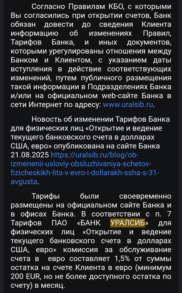 Преамбула: была зарплатным клиентом банка Уралсиб почти 10 лет. Соответственно, все скромные накопления хранились у них же, в т.ч. на валютных счетах. Среди прочего - 1к евриков на самый черный день. Лежат себе на обычном дебетовом счету, казалось бы, что могло пойти не так? Но. С 31ого августа 25ого года Уралсиб в одностороннем порядке меняет условия обслуживания валютных счетов, и теперь хранить евро в банке стоит... Барабанная дробь... 200 евро В МЕСЯЦ. Банк меня об этом конечно же "Оповестил", опубликовав информацию об измененю в договоре на официальном сайте. Письмо на почту? Пуш? Пффф, это же не предложение оформить кредитку, мелочь, хватит новости на сайте. В официальном ответе Уралсиба так и было сказано, мы оповещаем об изменении тарифов публикацией на сайте (пруфы ниже). Клуша, заметила я это лишь в декабре, лишившись 800 евро за 4 месяца. Включены ли у меня увед