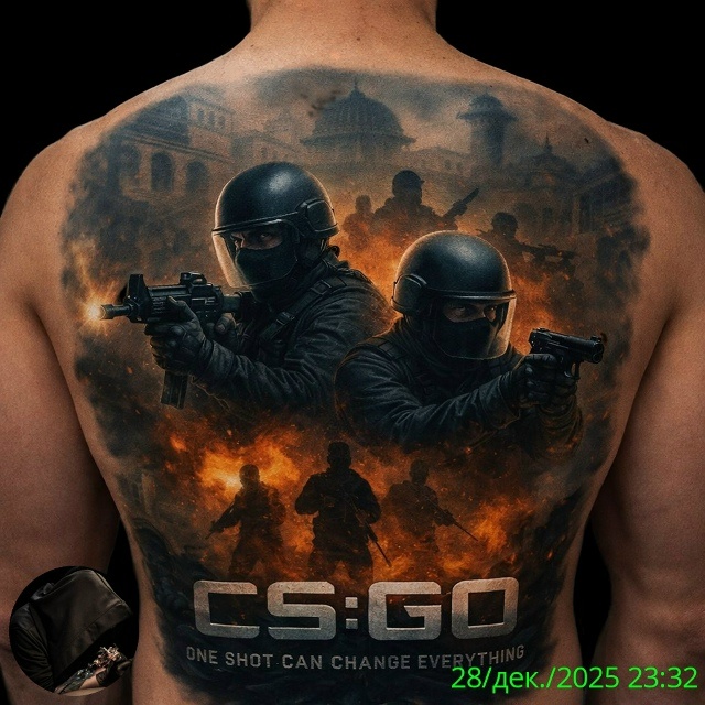 Татуировка, изображённая на фото, представляет собой яркий и детализированный рисунок, вдохновлённый популярной игрой Counter-Strike: Global Offensive (CS:GO). На ней изображены два бойца спецназа, вооружённые пистолетами, на фоне огненного хаоса и разрушенного города. В нижней части татуировки размещён логотип игры и слоган «One shot can change everything» («Один выстрел может всё