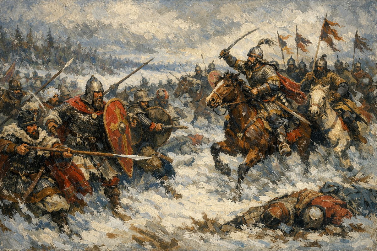 Осенью 1443 г. пожар пожег все «Поле», после чего наступила необычно холодная зима: «снези велици и ветри, и вихри силни» гуляли в степи, что тяжело отразились на татарских кочевьях. Зимой 1443/1444 гг. некий царевич Мустафа повел свою оголодавшую орду на Рязань, он «повоева власти и села Рязанскиа и много зла Рязани учинил». После этого царевич «с полоном многим» отошел и «ста на Поле», предложив рязанцам выкупить пленников, что те и сделали. Затем Мустафа снова вернулся в рязанские земли, теперь уже «на миру, хотя зимовати в Резани: бе бо ему супротивно на Поли», поступил он так, очевидно, из-за морозов и голода в степи «нужи ради великиа», что интересно, рязанцы пустили его в город. Когда о приходе татар и желании их зимовать в Рязанской земле узнал московский великий князь Василий II, он послал против них свой «двор» во главе с воеводами князем Василием Оболенским и Андреем Голтяевым, кроме того великий князь послал с ними «мордву на ртах» (лыжах) «понеже зима бе люта и снежна». Уз