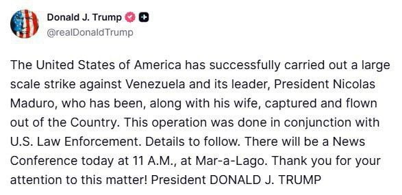 Трамп заявил, что Мадуро со своей женой были захвачены и вывезены из Венесуэлы. Как написал в соцсетях американский лидер, США провели успешную операцию, в которой принимали также участие американские правоохранительные органы. Трамп пообещал вскоре выступить в Мар-а-Лаго на пресс-конференции и предоставить все подробности. ❗️Операцию по захвату и вывозу из страны президента Венесуэлы Мадуро и его супруги провели бойцы Delta Foce — элитного спецподразделения ВС США, передает телеканал CBS со ссылкой на источники Lesen Sie weiter unten auf Deutsch...