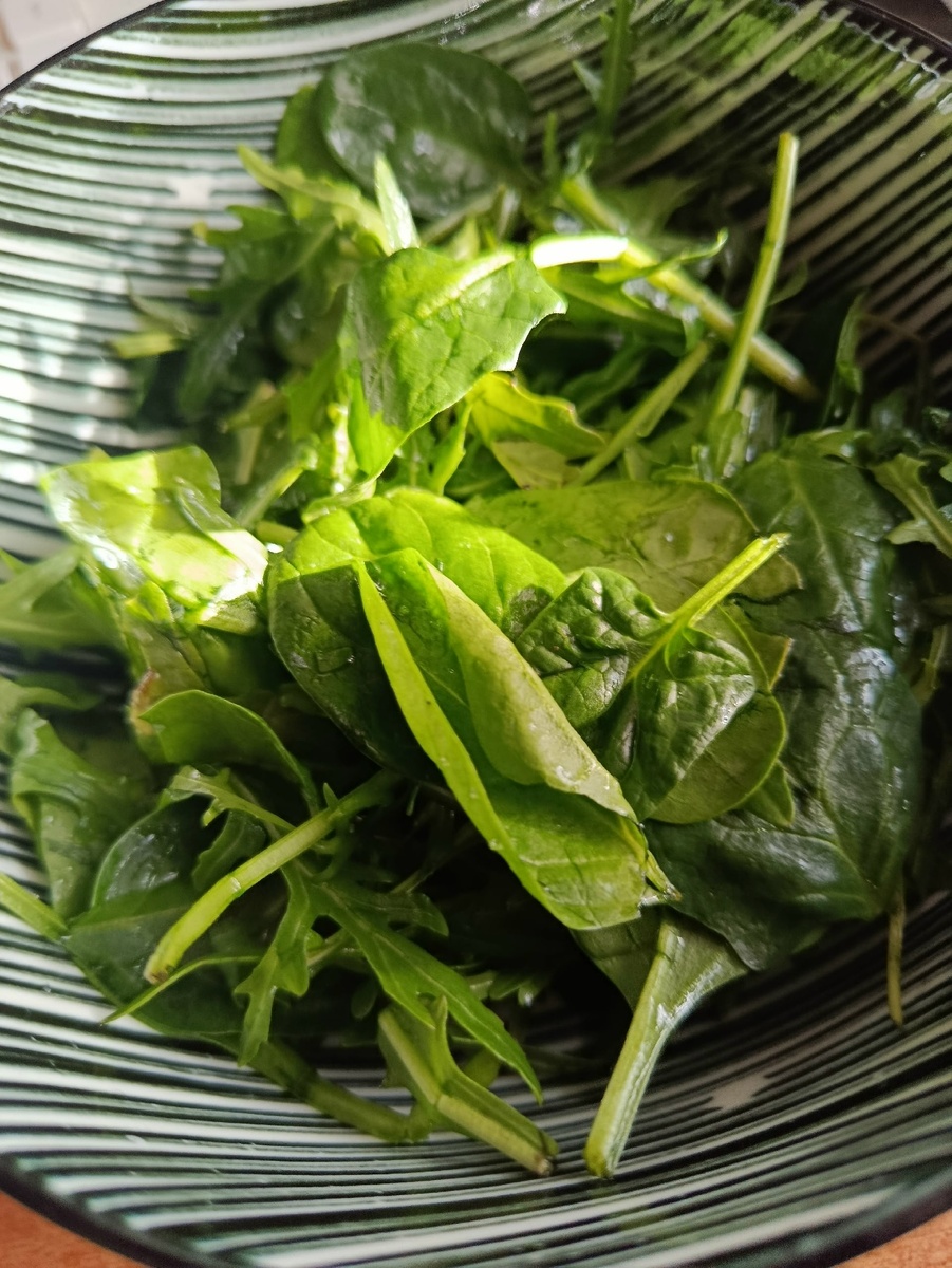 Решила я зайти в магнит, а там шпинат и руккола такие красивые и свежие, да и цена нормальная. Вот уж не думала ни, гадала. Купила и то и другое, дома кипятком обдала и с овощами очень вкусно получилось да ещё и с рыбкой запечённой.