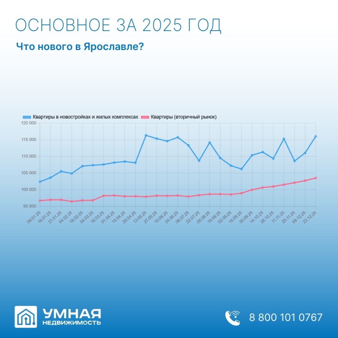 Уходящий год во многом стал временем перемен для рынка недвижимости. В Ярославле наблюдаются общероссийские тенденции. Однако есть некоторые особенности. И если вы думаете о покупке или продаже, самое время во всём разобраться. В отличие от общей тенденции в России (где вторичный рынок вырос всего на 1.9%; первичный — на 10,6%), в Ярославле цены росли более ощутимо. Средняя цена выросла на 13 612 рублей за квадратный метр. К концу года метр в новостройке в среднем стоил 116 021 рубль. Рост с начала года составил +13%. Подорожание составило 6 796 рублей за квадратный метр. Средняя цена составила 103 536 рублей. Годовой рост — +7%. В итоге ценовой разрыв новостройкой и вторичкой в Ярославле не такой драматичный, как в столице. На итоги 2025 года повлияли не только экономические факторы, но и важные законодательные решения: Итак, эти инициативы положительно повлияли на рынок. На первый план выходят прозрачность, защищённость участников сделки и ответственность застройщиков. На рынке нед