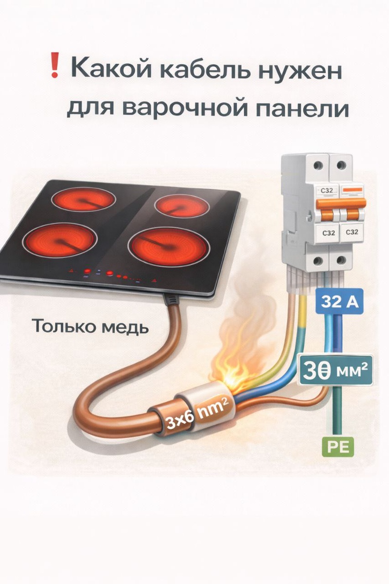 Что видно: Панель работает, но кабель и розетка греются, иногда выбивает автомат. Почему так: Варочная панель — мощный потребитель. Частая ошибка — подключать её к обычной розеточной линии или брать кабель «как на розетки». Мини-диагностика: Если варочная панель подключена кабелем 2,5 мм² или через обычную розетку — это уже неправильно. Что делать правильно: — Отдельная линия от щита — Только медный кабель — Сечение не менее 6 мм² (обычно ВВГнг-LS 3×6) — Автомат 32 А — Обязательное заземление (PE) Когда звать мастера: Если линия уже сделана неправильно, нет заземления или щит не рассчитан на такую нагрузку. Профилактика: Закладывать кабель под варочную панель ещё на этапе ремонта — переделка потом обходится дороже. ⚡ Вопросы и сотрудничество: Telegram: @help_electrik WhatsApp: +7 967 110-14-11 🌐 Сайт: https://electrik-clge.vercel.app/