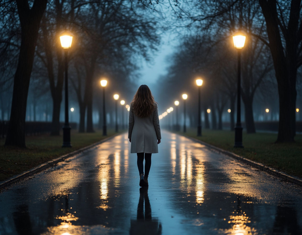 Вечером Лера вышла на короткую прогулку. Улица была тихой, освещённой редкими фонарями. Воздух пах осенью – листьями, дождём, чем‑то свежим и чистым. Она шла, не задумываясь о маршруте, просто позволяя ногам нести её вперёд.