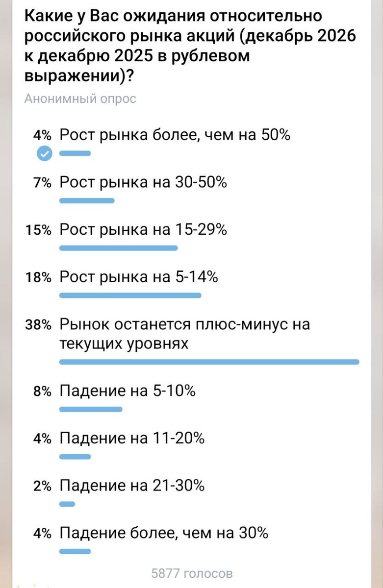 Каналов в ТГ увидел опрос по ожиданиям от рынка в 2026 году - абсолютное большинство ожидает стагнации.