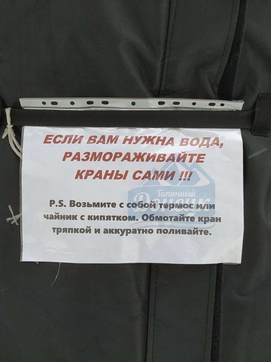 ☃️ Кризисный 2026-й врывается с двух ног! Объявление на утеплённой чехлом бочке с водой для населения в Калининском районе Донецка, ДНР. Напомним, что в сентябре 2025 года советник главы ДНР и родственница Дениса Пушилина Елена Никитина заявила, что вода в пластиковых ёмкостях для водоснабжения населения зимой не замёрзнет. "Опыт прошлого года говорит о том, что не успевает эта вода замёрзнуть. Во-первых, её разбирают, она движется. А во-вторых, самое главное, такое уязвимое место – это кран. Кран быстрее всего может замёрзнуть. Для этого у всех водителей на автоцистернах есть газовая горелка, они её будут отогревать, а потом как раз люди будут набирать воду. Но жизнь поправит. Будут в управе люди, которые будут за этим следить. И, в общем, мы все понимаем, что такая ситуация. Ну, зима, во-первых, смотря какая она будет, если она, по примеру, там, прошлых зим будет тёплая, будет вообще вопрос так не стоять. Но это же не говорит о том, что не могут быть морозы. Могут быть, и конечно