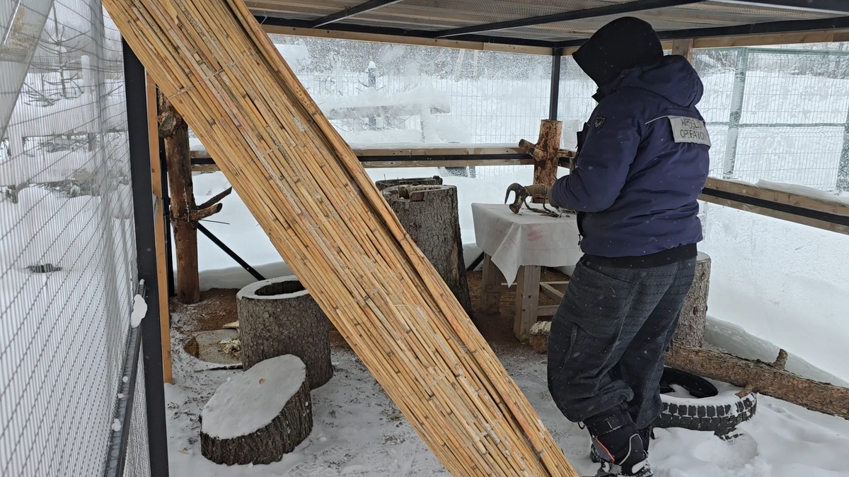Я изначально ещё на проекте вольера планировала сделать непрозоачный уголок, закрыв его ширмой из тростника.