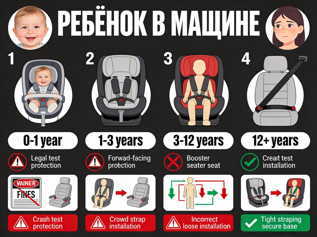 Одна из самых частых ошибок водителей — неправильное крепление ребёнка в машине. Люди ездят с ребёнком на коленях, с ремнём безопасности, без специального кресла. Штраф за это — от 3 000 до 30 000 ₽. Плюс, при ДТП ребёнок может не пережить аварию.