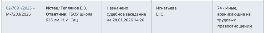 "Охрана рыбовЪ" продолжает Цикл статей про Евгения Теплякова. Евгений Валерьевич не был бы Тепляковым, если бы не подал на своего работодателя - Школу № 626 имени Сац, в Суд, при наличии повода и оснований. А повод с основаниями, судя по всему, у воспитателя появились. Заявление в Зюзинском суде было зарегистрирована 21 ноября, а 15 декабря Суд провел "беседу" и назначил заседание на 28 января 2026 года. Причины обращения в Суд Евгения Валерьевича не разглашаются, но ходят разговоры среди лиц, приближенных к Евгению Валерьевичу о том, что иск в Суд был подан в связи с бездействием руководства его работодателя, который "забыл" по неизвестной причине подготовить пакет документов на номинацию Евгения Валерьевича с супругой на вручение им ордена "Родительская слава". И вместо ордена с полагающейся к нему суммой в размере 500 тысяч рублей, 30 ноября 2025 года в Управе Котловка Евгению Валерьевичу вручили грамоту и букеты из цветов и лошариков Орден "Родительская слава" и полмиллиона ру