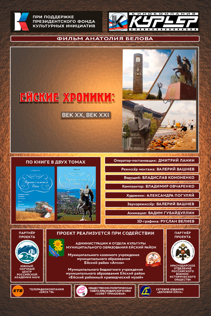 ℹ️ 12 января будет подписан приказ о запуске в производство третьего, заключительного фильма из киноальманаха «Ейские хроники». Он получил название «Ейские хроники: век XX, век XXI». 🇷🇺 Проект реализуется краснодарской кинокомпанией «Курьер» при поддержке Президентского фонда культурных инициатив и получил поддержку администрации и отдела культуры муниципального образования Ейский район. «Ейские хроники: век XX, век XXI» — не только ретроспективный экскурс в прошлое с анализом всех славных вех в развитии типичного приморского города, включенного в список исторических населенных мест России, но и обзор современного индустриального города, ставшего за минувший век шестым по численности населения в Краснодарском крае. ➡️ Научными консультантами и спикерами в фильме выступят кандидаты наук Владимир Громов, Геннадий Курков, Юрий Артюхин, Александр Бурмагин, а также ейские архивисты и краеведы. 🎥 Экспедиционные съёмки 26-минутного научно-популярного фильма будут проходить в 2 этапа — в м