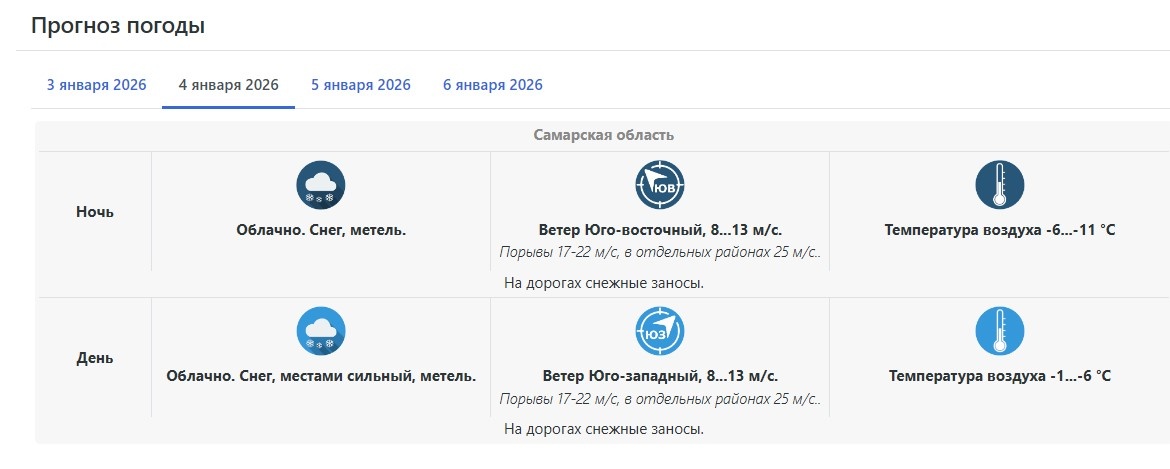 В воскресенье, 4 января, синоптики Приволжского УГМС прогнозируют облачный и снежный день, сопровождающийся заметным усилением ветра и метелью. Жителям области стоит проявить внимательность, особенно при планировании поездок на личном транспорте. Ночью температура воздуха в регионе будет колебаться в пределах -6...-11 °C. Ожидается снег и метель при юго-восточном ветре, скорость которого составит 8–13 м/с. В отдельных районах возможны сильные порывы до 17–22 м/с, а местами и до 25 м/с. Из-за плотного снега и ветра на дорогах области могут образоваться снежные заносы, что осложнит движение и снизит видимость. В дневные часы в Самарской области станет значительно теплее — столбики термометров поднимутся до отметок -1...-6 °C. Характер погоды существенно не изменится: небо останется затянутым тучами, пройдет снег (местами сильный), продолжится метель. Ветер сменит направление на юго-западное, сохраняя прежнюю скорость и шквалистые порывы до 25 м/с. Фото: Приволжское УГМС Народные приметы: