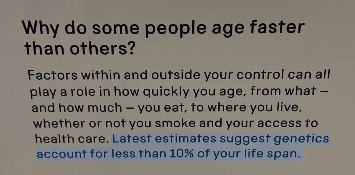 ? Я думал на 80-90%. Занимайся спортом, правильно питайся, сможешь увеличить продолжительность на 10-20%. Пей, кури, тоже максимум 10-20%, но сторону уменьшения. А эта фотография из музея науки в Лондоне. Мнение “Британских ученых”. Удивился и решил проверить откуда взялись 10%. ТЛДР: ученые так и не решили какие цифры правильные и результаты современных исследований варьируются от 2% до 50%+. В любом случае, даже если 50% это гены, а другие 50% это образ жизни и прочее внешнее, получается, стоит попыхтеть в спортзале и над салатом!