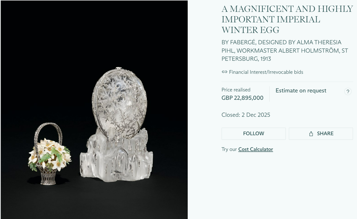 "Зимнее" яйцо Фаберже, бар-носорог Лаланна и лампа Тиффани - рекорды декабря