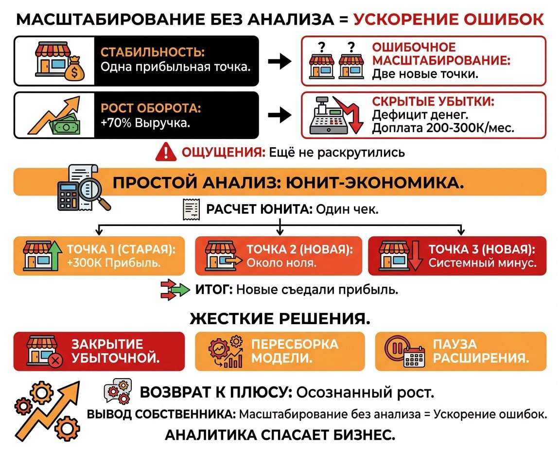 Бизнес работал стабильно: одна точка уверенно приносила прибыль. Собственник решил масштабироваться - почти одновременно открыли ещё две точки в других районах.