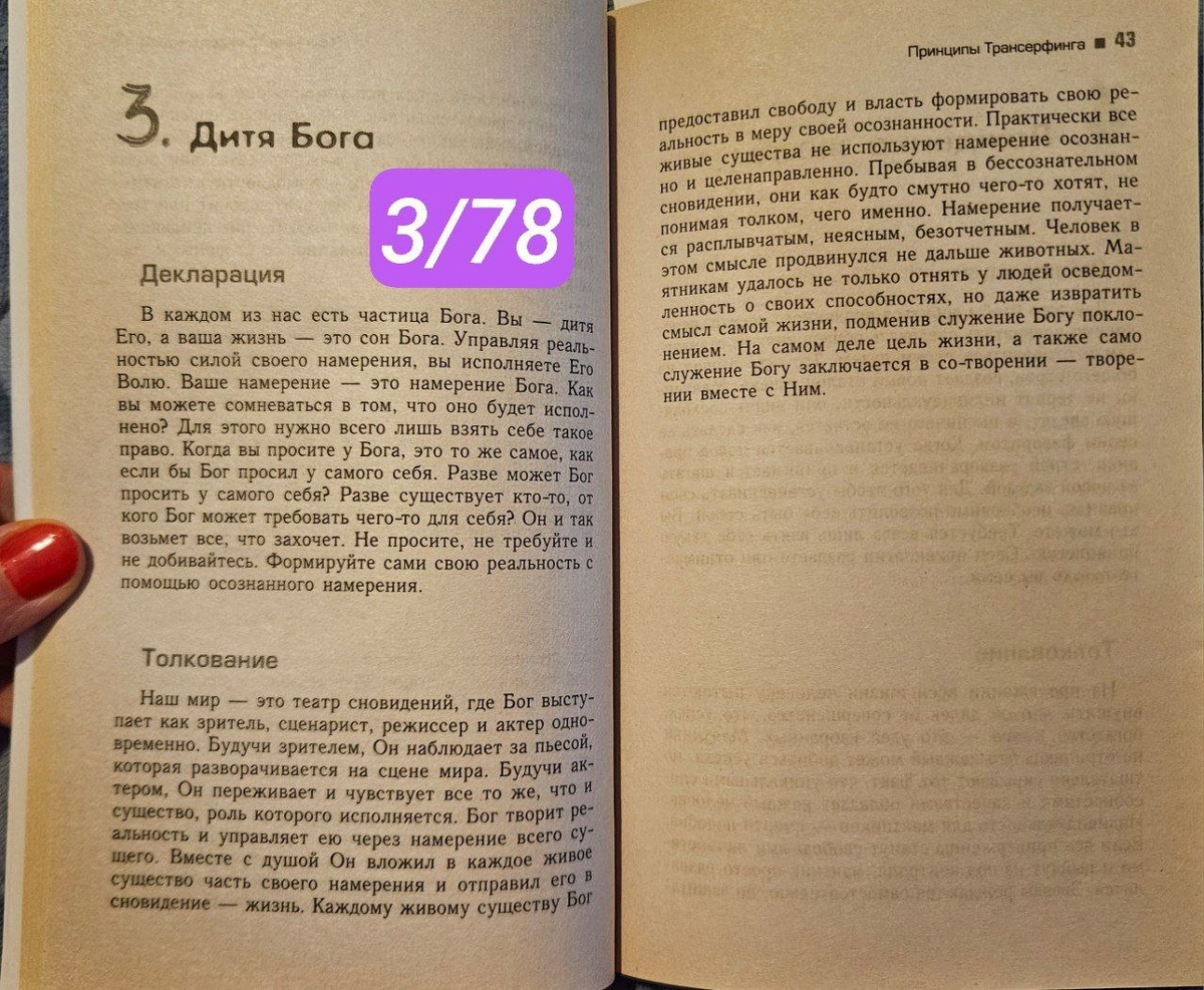 3/78 Практикум управления реальностью - Трансерфинг Дитя Бога "Управляя реальностью силой своего намерения, вы исполняете волю Бога. Ваше намерение - намерение Бога. Как вы можете сомневаться, что оно будет исполнено? Для это лишь нужно взять себе такое право." "Каждому живому существу Бог предоставил свободу и власть формировать свою реальность в меру своей осознанности. Практически все живые существа не используют намерение осознанно и целенаправлено. Они как-будто смутно чего-то хотят, не понимая чего именно. Намерение получаетсч неясным, расплывчатым, безотчетным." "Цель жизни, а также само служение Богу, заключается в со-творении, творении вместе с ним". ❣Как у вас сейчас с правом создавать свою реальность, с ясностью желаний, осознанным и целенаправленным намерением? P.s. "Намерение - это решимость иметь и действовать". Даже если вам пока не очень понятен текст, просто продолжайте читать, поверьте, он заряженный, я уже 5ый подход к этому снаряду делаю, и каждый раз глубже