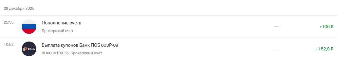 Здравствуйте. Сегодня 3 января, первая суббота 2026 года. В этой статье расскажу все что было сделано за прошедшую неделю. На этом 2025 год закончился. Меня не устроила ситуация с пойманным дефолтом и снижением стоимости активов и купонного потока, поэтому решил немного увеличить портфель. Все покупки будут фигурировать уже с января, а в декабре картина получилась такая. План на январь 2026. Пока по плану 3 496,7 рублей, но еще не известна сумма по бумагам "Газпром капитал выпуск 14". Думаю факт прошлого месяца точно обгоню, постараюсь чтобы этот факт был выше плана предыдущего месяца (3 583,91 р.). Облигации Монополии также в портфеле, но в список их добавлять не стал, как только по ним пойдут движения, напишу отдельно. Согласно отчету от брокера то 37 913,03 рублей. Даже с учетом дефолта все свои средства сохранены, получена прибыль. Для первого года инвестирования считаю хороший результат. На сегодня у меня все. Благодарю за внимание. (Не является инвестиционной рекомендацией)