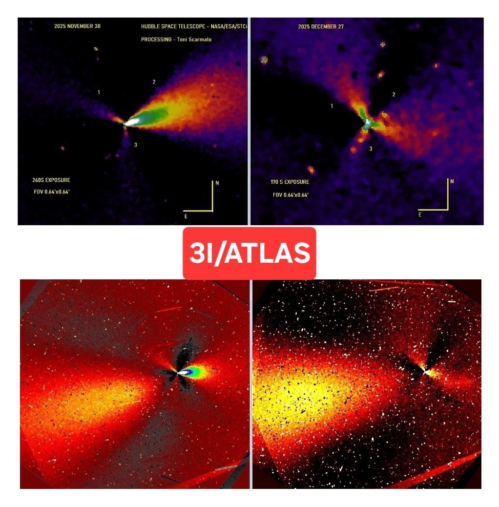 ? Астрономы, изучающие новые изображения, полученные с помощью космического телескопа «Хаббл», обнаружили нечто крайне странное в межзвездном объекте 3I/ATLAS — и это заставляет ученых задуматься. В течение нескольких недель «Хаббл» получил 17 четких изображений, демонстрирующих мощные струи вещества, вырывающиеся из этого объекта по мере его движения через нашу Солнечную систему. Одна массивная струя простирается почти на 100 000 километров и направлена прямо к Солнцу. Но ближе обнаруживается нечто еще более странное: три меньшие струи, равномерно расположенные, как вершины идеального треугольника, разделенные ровно 120 градусами. Природа редко отдает предпочтение такой чистой симметрии. Поскольку объект совершает один оборот вокруг своей оси каждые 16 часов, эти струи медленно меняют направление, как будто установлены на вращающемся теле. Ученые полагают, что струи могут исходить из ледяных областей на поверхности, нагреваемых солнечным светом и выбрасывающих газ с высокой скорос