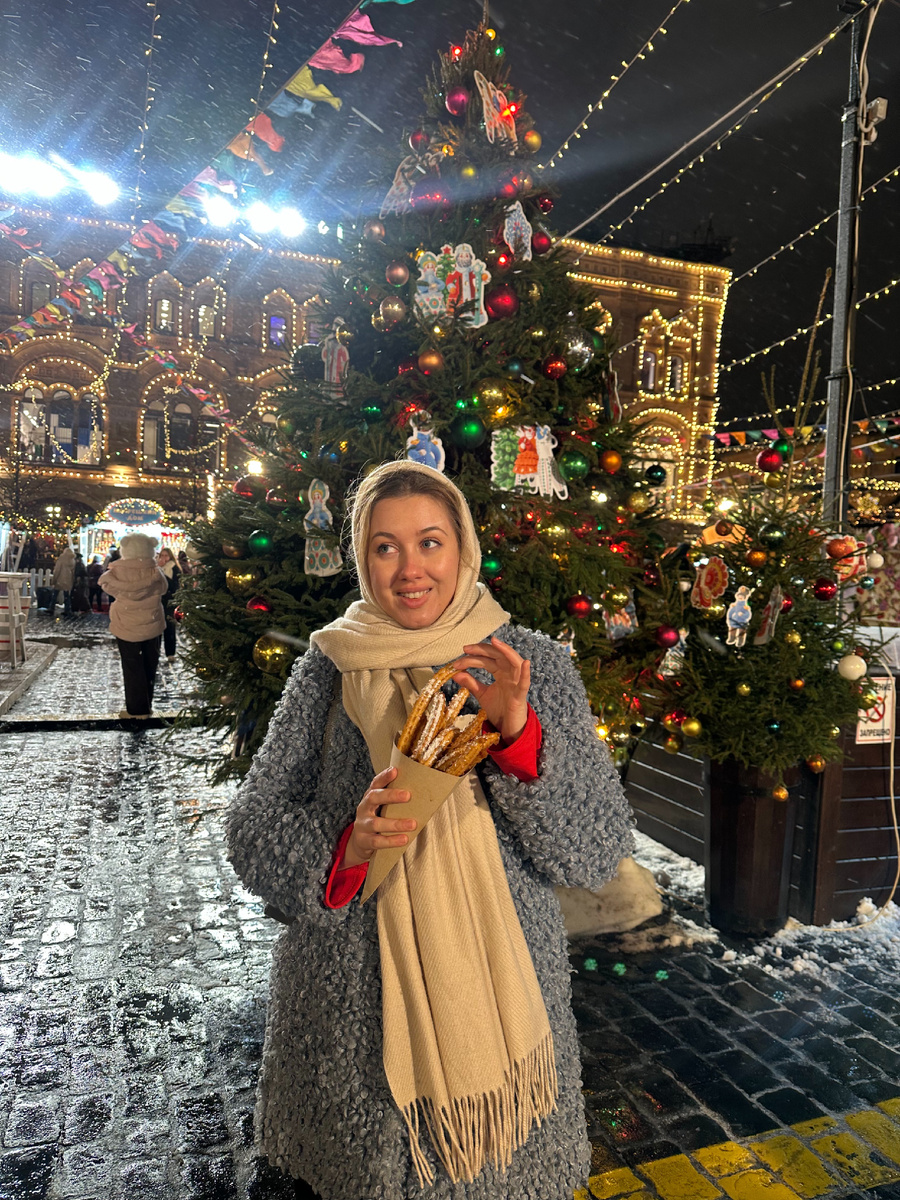 Выходим на станции Площадь Революции и попадаем на ярмарку на Манежной площади. Здесь стоит невероятно красивая большая ёлка, сцена с живыми представлениями, а в толпе ходят ряженые. Здесь же можно пить