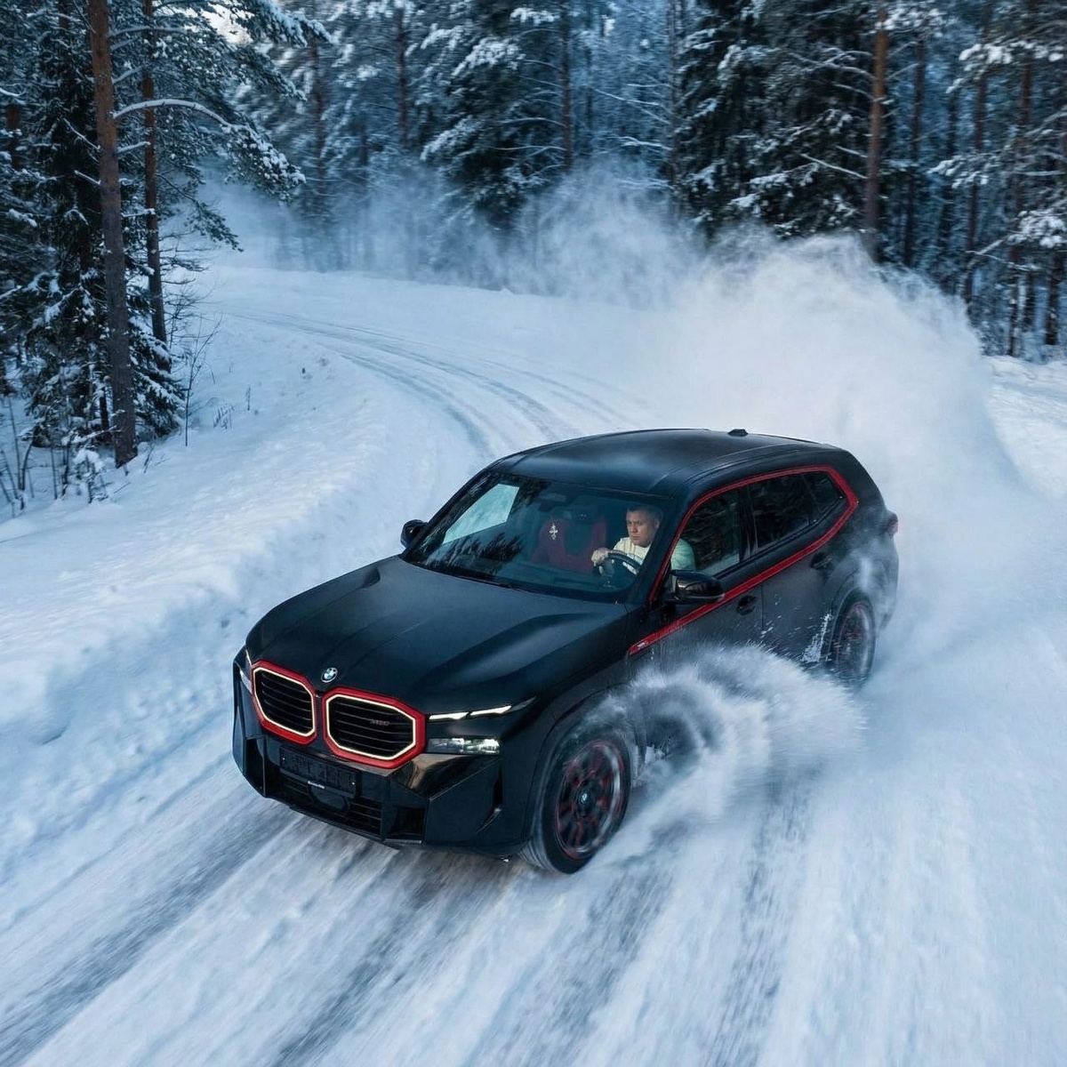Не изменяй лицо, черты лица мужчины, отобрази в точности как на эталонном фото. Вид сверху: машина динамично дрифтит по заснеженной лесной дороге, вокруг разлетается снег, естественно и реалистично. Мужчина сидит за рулем, его лицо видно в кадре. Холодный свет, приглушённый фон, атмосферный ультрареалистичный стиль кадра из кино 💵 Отблагодарить