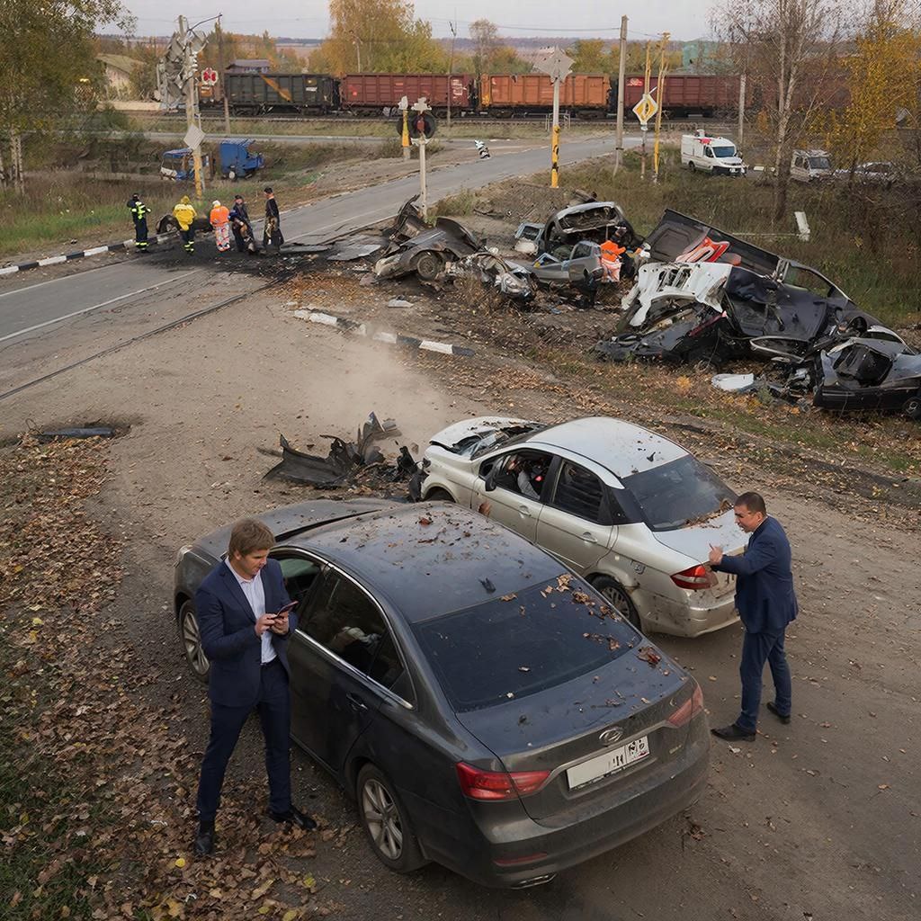 Добрался до переезда через железную дорогу. От него до нашего поселка 5 минут езды. Смотрю, а там — страх и ужас. Стоит товарняк, а вдоль всего полотна куски автомобилей валяются: искореженные бамперы, двери, капоты, багажники, даже одну крышу я заприметил Вокруг суета: полиция бумаги пишет,спасатели людей из изуродованных машин извлекают, медики тут же первую помощь оказывают, серьезно пострадавших в больницу отправляют (при мне две скорые стартовали). Остановился я, стал зевак расспрашивать, что случилось. Мне рассказали, что шел состав, шлагбаум был опущен. И туг в череду стоящих перед переездом автомобилей на полной скорости врезался груженный кирпичом КамАЗ: тормоза у него отказали. Сплошное месиво случилось, но самое страшное — находившиеся в голове очереди три или четыре машины вылетели прямо под колеса товарняка. Им и сидящим в Них людям досталось больше всего.