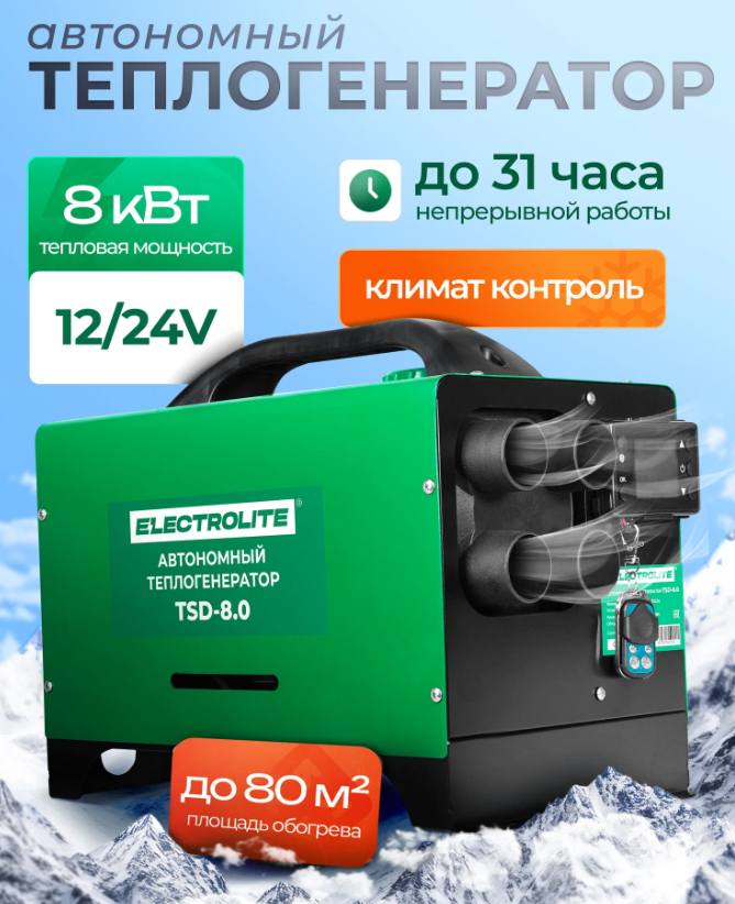 Вы водитель дальнобойщик, и морозным утром за окном -25°. Но в кабине — весенняя теплота, двигатель не застучал от холода, и вы просто заводите машину. Или вы — владелец склада, где от перепадов температуры портится товар. Но ваш склад стабильно прогрет, а счета за отопление не кусаются. Это — реальность с автономным дизельным отопителем Electrolite TSD 8. Зима в России — это серьезное испытание и для техники, и для людей. Запуск промерзшего двигателя — это убийственный износ. Прогреть гараж, ангар, бытовку или кабину грузовика обычными способами — долго, дорого и не всегда безопасно. Что, если есть решение «все в одном»? Умное, экономичное и независимое. Это не просто «печка». Это высокотехнологичный тепловой генератор, который работает независимо от двигателя автомобиля или стационарной электросети. Он берет минимум энергии от аккумулятора (12 или 24В), а основное «топливо» для тепла — дизель из вашей же топливной системы или отдельного бака. Характеристики Почему водители и бизн