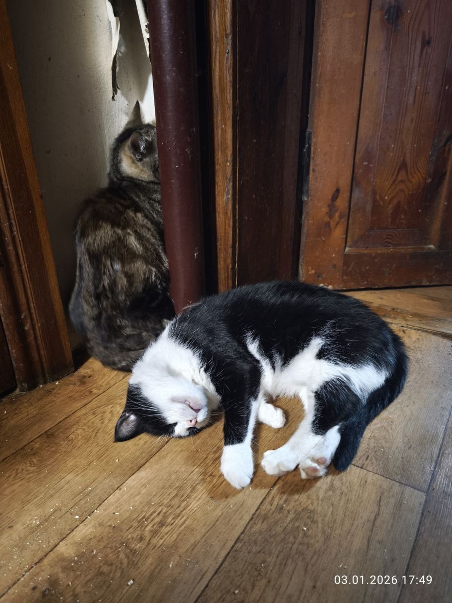 🥰 Пеструня любит посидеть у тёплой трубы, а Василисе жарко, улеглась спать у двери🤭 Кстати, у Василисы прогресс! Она стала есть сама и больше из шприца её не кормят👏 #Пеструня #Василиса