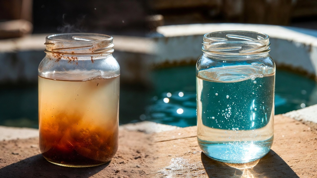 Весной, когда снег сошёл, открыли дачу. Первым делом — проверить воду. Набрал в банку, посмотрел на свет. Серая какая-то, с белыми хлопьями плавает. Дал Кате попробовать.