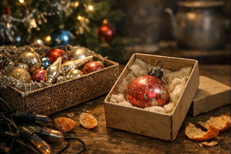 Потом доставали коробки с игрушками: блестящие шары, стеклянные сосульки, фигурки в упаковках, которые жалко рвать — будто они ещё сохраняют право быть “идеальными”, пока их не коснулась жизнь.