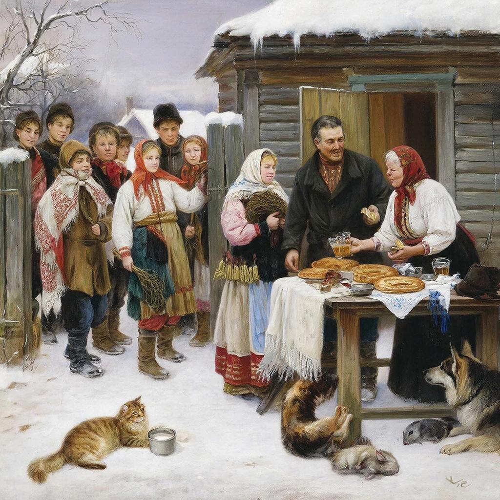 Когда мы только сюда переехали, помню в 6 утра завалился сосед, расстелил на полу фуфайку и пел песни, очень длинные колядки. И я должна была налить и накормить, чтобы живность водилась и достаток был в доме.