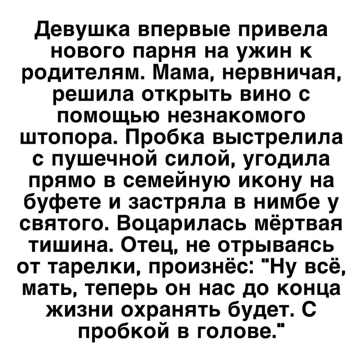 Девушка впервые привела нового парня на ужин к родителям. Мама, нервничая, решила открыть вино с помощью незнакомого штопора. Пробка выстрелила с пушечной силой, угодила прямо в семейную икону на буфете и застряла в нимбе у святого. Воцарилась мёртвая тишина. Отец, не отрываясь от тарелки, произнёс: "Ну всё, мать, теперь он нас до конца жизни охранять будет. С пробкой в голове."
