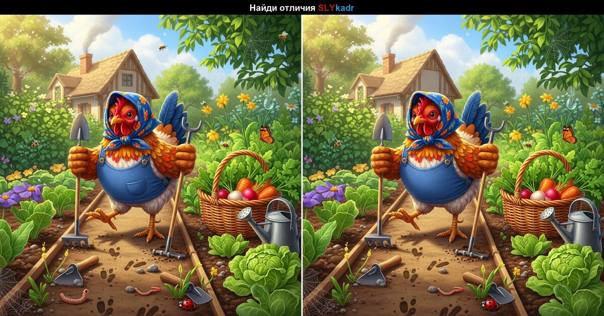 Привет, любители головоломок! Мы рады приветствовать вас на канале 'Хитрый кадр' в Дзен. Сегодня у нас для вас особенная задача: в этой картинке спрятано несколько отличий, которые нужно найти. Курица в огороде так старается, а вы сможете найти все мелкие детали? Удачи! Ну что, получилось ли найти все отличия? Если да, то не забудьте поделиться этим заданием с друзьями! Подписывайтесь на наш канал, чтобы не пропустить новые головоломки и весёлые задачи. Отгадка ниже. 🍳