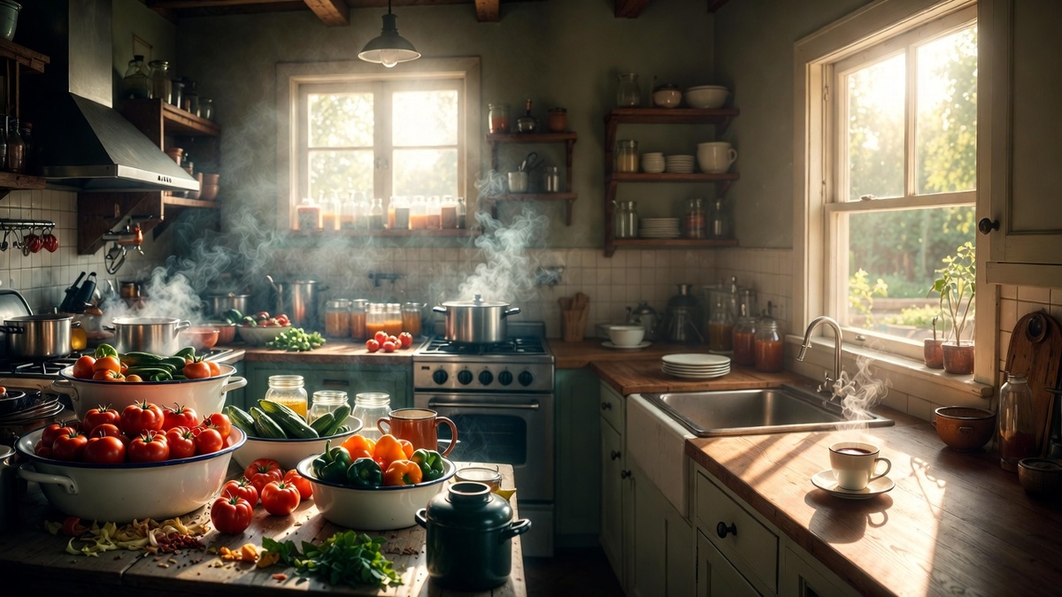 К десяти утра на кухне уже работает три конфорки. Кастрюли кипят, банки стоят рядами на столе. Ленка режет помидоры, параллельно что-то варит, помешивает.