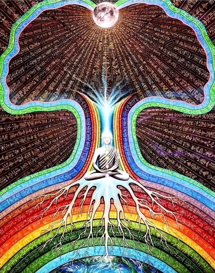 - Перевёрнутое древо познания (Ашваттха). Его корни уходят в высшую, трансцендентную реальность (Брахман, Сахасрара-чакра), а ветви и листья нисходят вниз, образуя всё многообразие феноменального мира. Это символ того, что всё знание — от математики до поэзии — произрастает из единого источника. Задача йогина — пройти по стволу этого древа в обратном направлении, от множественности листьев (конкретных наук и впечатлений) к единству корня.
