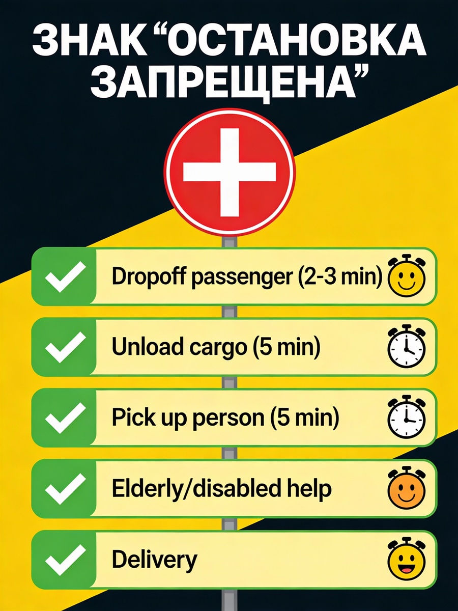 Остановка для погрузки-разгрузки допускается даже при знаке "Остановка запрещена", если ты делаешь это за 2-5 минут.