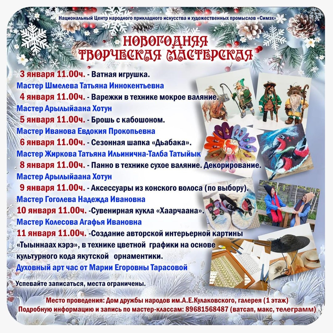 #МК 4 января — Варежки в технике мокрое валяние, мастер Арылыйаана Хотун 5 января — Брошь с кабошоном, мастер Иванова Евдокия Прокопьевна 6 января — Сезонная шапка «Дьабака», мастер Жиркова Татьяна Ильинична-Талба Татыйык 8 января — Панно в технике сухое валяние. Декорирование. Мастер Арылыйаана Хотун 9 января — Аксессуары из конского волоса (по выбору), мастер Гоголева Надежда Ивановна 10 января — Сувенирная кукла «Хаарчаана», мастер Колесова Агафья Ивановна 11 января — Создание авторской интерьерной картины «Тыыннаах кэрэ», в технике цветной графики на основе культурного кода якутской орнаментики. Духовный арт час от Марии Егоровны Тарасовой Ежедневно с 11:00 часов ДДН им. А.Е. Кулаковского, Пояркова, 4 +7(968)156-84-87 Online Якутия | Ждем вас в МАХ