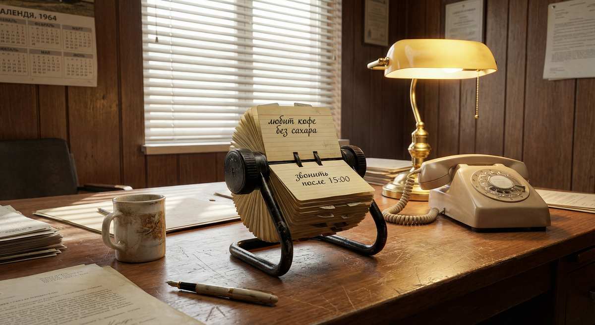 Представьте офис 1960-х годов. На столе продавца — вращающаяся картотека Rolodex. Карточки с именами клиентов, телефонами и пометками: «любит кофе без сахара», «звонить после 15:00».