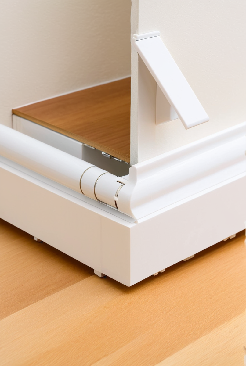 Универсальный уголок — это инновационная фурнитура для плинтуса, которая кардинально упрощает отделку помещений. Его шарнирная конструкция, разработанная специально для пластикового плинтуса и изделий из ПВХ, состоит из двух частей, соединенных подвижным элементом. Это позволяет ему адаптироваться под любой нестандартный угол, что является частой проблемой при ремонте. Такой регулируемый угол — идеальное решение, как обойти угол, отличающийся от прямого, будь то эркер или просто стык стен с отклонениями. Благодаря этому элементу комплектующих, сложная подрезка не требуется, что делает монтаж плинтуса доступным даже для новичков, выполняющих работы своими руками. Шарнирный уголок обеспечивает идеальное примыкание.