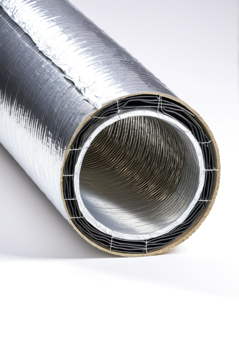 Высокие технические характеристики изделия обусловлены его многослойной конструкцией. Внутренняя основа — это спиральный каркас из упругой стальной проволоки, задающий форму канала. Поверх него уложен утеплитель, чаще всего это негорючая минеральная вата толщиной от 25 мм, отвечающая за сохранение температуры. Для защиты изоляции от влаги предусмотрен слой пароизоляции, который предотвращает образование конденсата внутри материала. Внешняя оболочка, выполненная из прочной ламинированной алюминиевой фольги, обеспечивает механическую защиту, целостность всей конструкции и абсолютную герметичность, эффективно защищая от внешних факторов. Именно такая структура гарантирует долговечность и надежность!