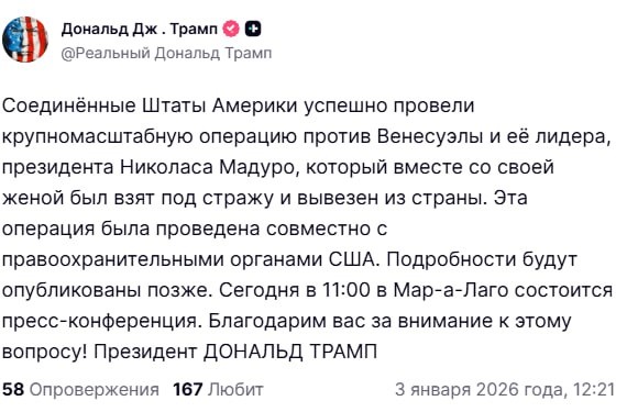 ❗️Президент Венесуэлы Николас Мадуро вместе с женой был захвачен и вывезен из страны