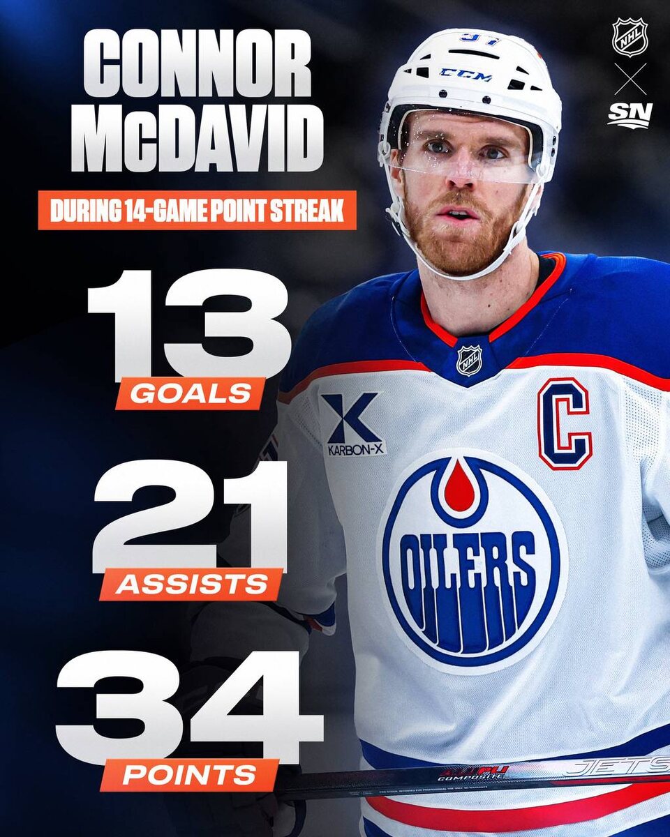 Скоро лига перейдет на формат 84 игры в регулярке. 14 матчей - ровно одна шестая часть. Умножаем эти цифры Коннора на шесть. 78 голов, 126 передач, 204 очка. За всю историю НХЛ только один человек набирал больше двухсот очков. Сами понимаете, о ком речь. Гретцки делал это в чемпионатах 1981/82 (212), 1983/84 (205), 1984/85 (208), 1985/86 (215).