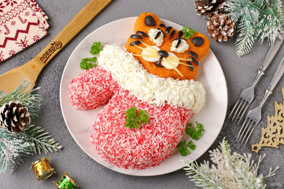 Основной ингредиент: Крупы, Рис, Яйца, Крабовые палочки Блюдо: Салаты 🍲 Порций: 6 | ⏱️ Время: 1ч. 0м. Салат "Тигр в варежке" с символом будущего года. Несмотря на довольно простой состав, салат получается очень вкусный, а оригинальная подача не оставит его на праздничном столе без внимания. Описание приготовления: Приготовить крабовый салат "Тигр в варежке" на Новый год достаточно просто. А вот украсить саму варежку можно так, как позволит фантазия. Аналогично можно приготовить любой салат, куда входят крабовые палочки. Берите рецепт на заметку! СОСТАВ: • Крабовые палочки - 200 грамм • Яйцо - 4 штуки • Лук - 1 штука • Морковь - 1-2 штук • Рис - 4 ст. ложки • Кукуруза консервированная - 1 банка • Маслины - 5-7 штук • Майонез - по вкусу • Соль - по вкусу • Перец черный молотый - по вкусу КАК ПРИГОТОВИТЬ "Салат "Тигр в варежке"": Подготовьте все ингредиенты. Заранее отварите яйца и морковь, дайте остыть. Рис промойте и отварите в подсоленной воде до готовности, затем откиньте на сито и