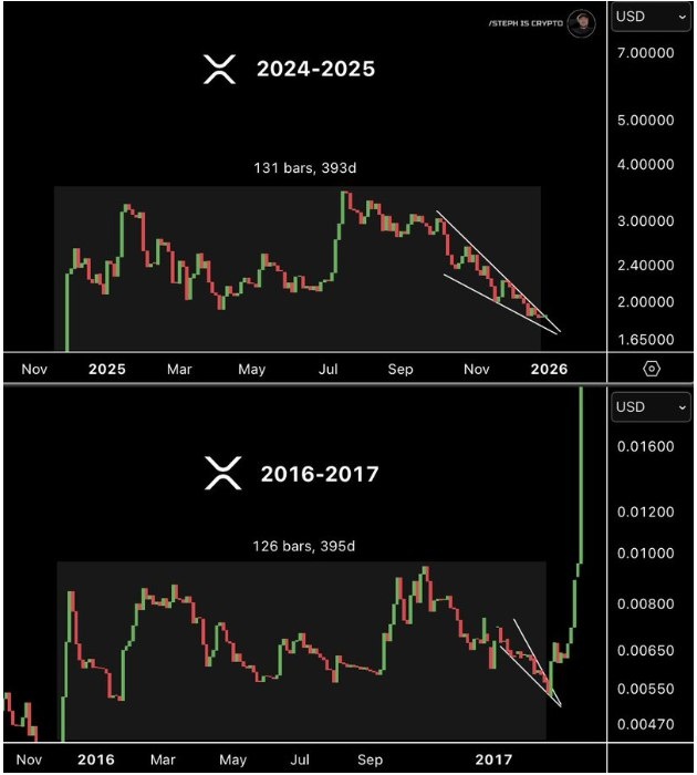 ΠΎΠ΄ΠΈΠ»ΡΡ Π² Π±ΠΎΠΊΠΎΠ²ΠΎΠΌ Π΄Π²ΠΈΠΆΠ΅Π½ΠΈΠΈ 395 Π΄Π½Π΅ΠΉ ΠΏΠ΅ΡΠ΅Π΄ Π·Π½Π°ΡΠΈΡΠ΅Π»ΡΠ½ΡΠΌ ΡΠΎΡΡΠΎΠΌ. Π’Π΅ΠΊΡΡΠΈΠΉ ΡΠΈΠΊΠ» Π² 2025 Π³ΠΎΠ΄Ρ ΡΠΆΠ΅ Π½Π°ΡΡΠΈΡΡΠ²Π°Π΅Ρ 393 Π΄Π½Ρ ΠΊΠΎΠ½ΡΠΎΠ»ΠΈΠ΄Π°ΡΠΈΠΈ, ΡΡΠΎ ΡΠΊΠ°Π·ΡΠ²Π°Π΅Ρ Π½Π° ΠΏΠΎΡΠ΅Π½ΡΠΈΠ°Π»ΡΠ½ΠΎΠ΅ ΠΏΠΎΠ²ΡΠΎΡΠ΅Π½ΠΈΠ΅ ΡΡΠ΅Π½Π°ΡΠΈΡ. ΠΠ»ΡΡΠ΅Π²ΡΠ΅ ΠΌΠΎΠΌΠ΅Π½ΡΡ: - XRP Π² 2017 Π³ΠΎΠ΄Ρ ΡΠΎΡΠ³ΠΎΠ²Π°Π»ΡΡ Π² Π΄ΠΈΠ°ΠΏΠ°Π·ΠΎΠ½Π΅ $0.005-$0.01, ΠΏΠΎΡΠ»Π΅ ΡΠ΅Π³ΠΎ ΠΏΠΎΡΠ»Π΅Π΄ΠΎΠ²Π°Π» ΡΠΎΡΡ Π½Π° 5,000%. - Π 2025 Π³ΠΎΠ΄Ρ XRP ΠΊΠΎΠ½ΡΠΎΠ»ΠΈΠ΄ΠΈΡΡΠ΅ΡΡΡ Π²ΠΎΠΊΡΡΠ³ $1.70-$1.90 ΠΏΠΎΡΠ»Π΅ Π΄ΠΎΡΡΠΈΠΆΠ΅Π½ΠΈΡ ΠΏΠΈΠΊΠ° ΠΎΠΊΠΎΠ»ΠΎ $3.40. - ΠΠ½Π°Π»ΠΎΠ³ΠΈΡΠ½ΡΠΉ ΠΏΡΠΎΡΡΠ² Ρ ΡΠ΅ΠΊΡΡΠΈΡ