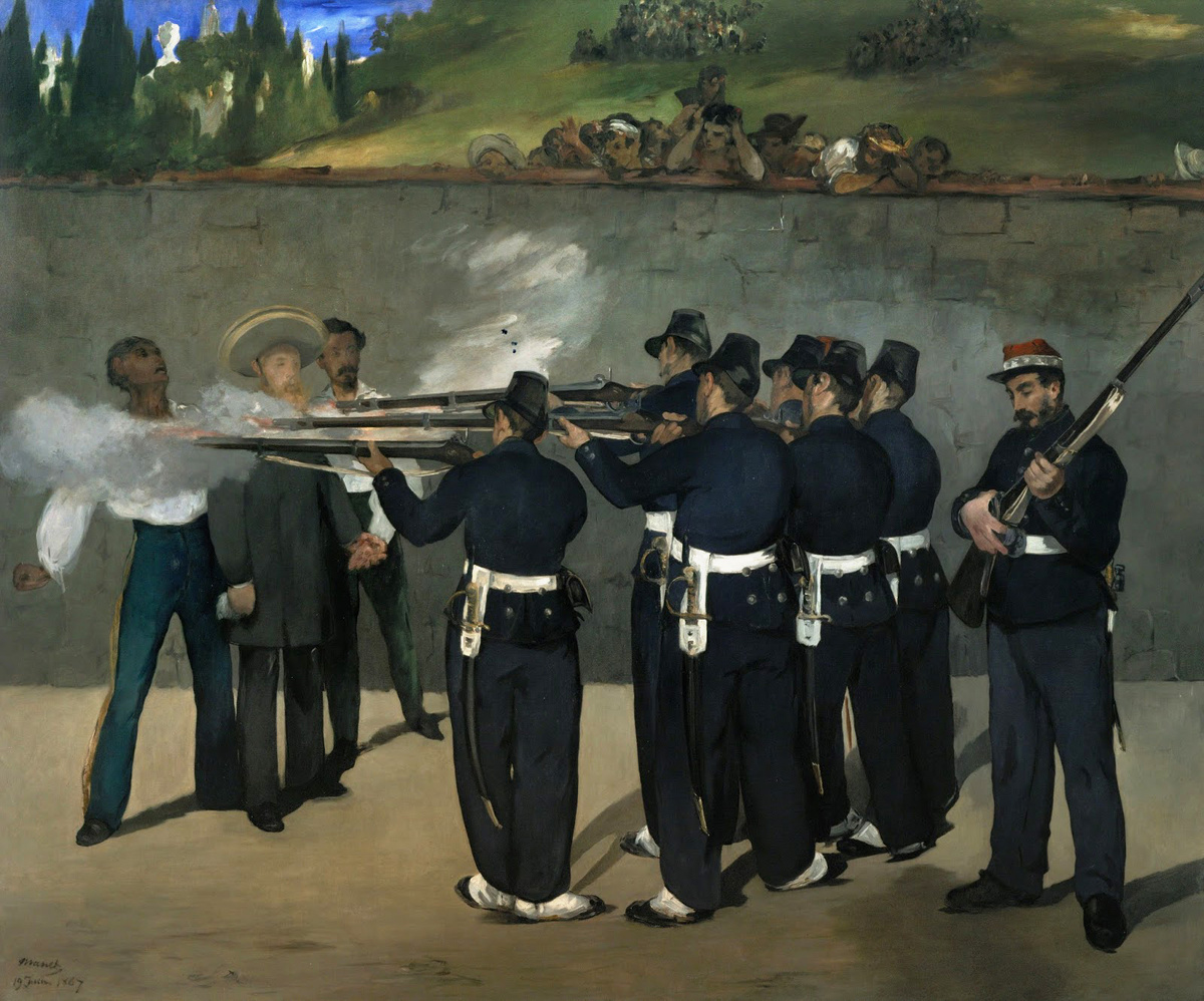 Перед нами картина французского художника Эдуарда Мане (1832–1883). На ней изображено драматическое завершение Второй Мексиканской империи. В начале XIX века в Мексике развернулась борьба между либеральными и консервативными силами за власть и реформу законодательства. Она привела к открытой войне в 1858 году (Война за реформы). После поражения консервативных сил в 1861 году они бежали из страны, и нашли помощь во Франции, когда новый либеральный президент Мексики Бенито Хуарес приостановил выплаты процентов по кредитам иностранным государствам. В 1862 году французская армия высадилась в Мексике и двинулась на Мехико. Хотя мексиканской армии удалось разгромить французскую в битве при Пуэбле 5 мая 1862 года, французы вошли в Мехико 7 июня 1863 года. Новое (консервативное) мексиканское правительство провозгласило католическую Мексиканскую империю. Корона этой новой империи Наполеоном III была настойчиво предложена эрцгерцогу и принцу Фердинанду Максимилиану Австрийскому. Через ка